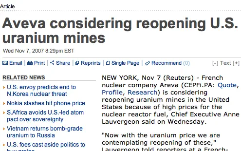 Reading a little deeper into the article, I found an interesting statement for future predictions about uranium prices and also found the statement that caused Google to pick this article as one that I would be interested in reading: