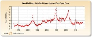 Some would probably argue that any time you increase production, it will increase supply, lowering costs. That has been true with Gas in the U.S., but I expect that’s because the infrastructure wasn’t in place to export the gas en masse? As more and more of that export infrastructure comes online, I would expect the price to rise up to that $5-6 range that Chesapeake predicts – after all, they should be in a very good position to predict such things.