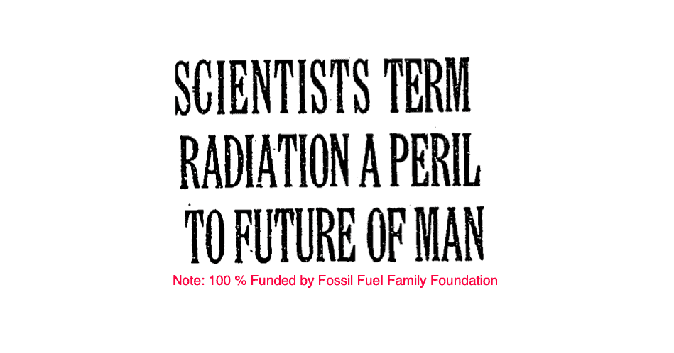 For several years following the issuance of the BEAR 1 report, committee members and various Rockefeller Foundation-supported researchers worked hard to spread the idea that there are no safe doses of radiation. Their effort helped to fertilize the seeds of doubt about nuclear energy that the committee carefully planted. Here’s an example from Nov 15, 1956.