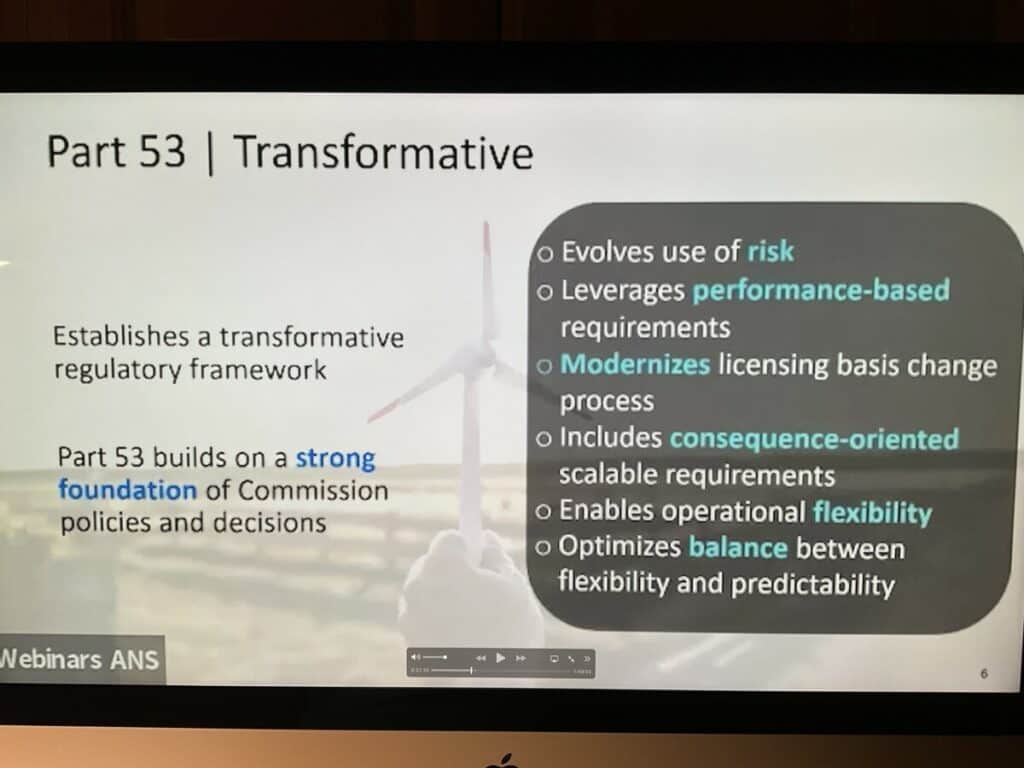 He included some important words in his talk. He said that he and his team are as excited about the opportunities provided by advanced nuclear energy as anyone and said that his goal was to perform his job “in an enabling way” while remaining cognizant that he is not supposed to be an advocate. The role of his organization is to make safe use of nuclear technology possible. They want to give the public additional options and want to do their job in a way that returns value to the public.