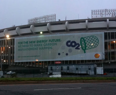 I took the post leading photo of the sign from a pull-off at the west end of the bridge, so the entire sign is visible, but for most of the trip across the bridge, you cannot really read the words on the left side. They are obscured by a line of streetlights down the center divide of the bridge. This billboard has been hanging on the stadium east side for the past several months. Every time I see it, I kind of chuckle and wonder if the people involved in the review and approval of the ad recognize just how honestly they have portrayed the elusive notion of carbon capture and sequestration (CCS). I will leave it at that and hope that you recognize what I am talking about and contribute to a conversation about the sign and CCS technology.