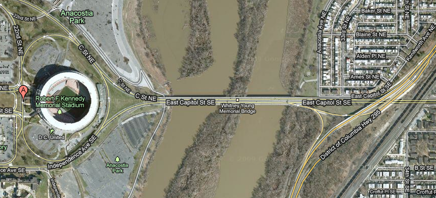 The Robert F. Kennedy Memorial Stadium (RFK to most DC residents) sits at the west end of the bridge. Because of its size and prominent location, it often hosts large temporary advertisements. On a road network where billboards are rare, those signs stand out. That bridge happens to be a heavily traveled route into the city, so the signs get exposed to a lot of eyeballs.