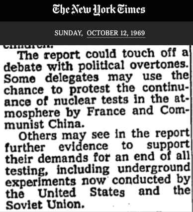On October 12, 1969, the New York Times published an article written by Kathleen Teltsch under the following headline: “RADIATION LINKED TO RETARDATION: U.N. Report Warns of Even Low Doses in Pregnancy.”