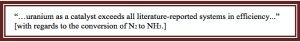 In theory, this uranium catalyst could be useful for the utilization of carbon dioxide, although many other catalysts that can do the same thing are widely known. For instance, references 7 and 8 are the same description in two languages of a process to prepare a methanol derivative from carbon dioxide via hydrogenation using a uranium catalyst. Methanol potentially represents a fuel to displace gasoline and other motor fuels.9 If the carbon dioxide source is a dangerous fossil waste stream, the hydrogenation could represent a carbon neutral path to motor fuels – allowing the phase out of petroleum and petroleum mining – or better yet, in the case of carbon capture from the air, possibly via a biological intermediate or even by direct capture, then motor fuels might actually represent, briefly at least, a carbon negative technology.