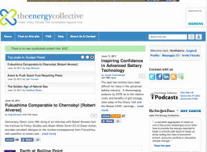 Rod, I am reading with distress your criticism of our moderation policy at The Energy Collective, because as you know, we have in the three years we’ve been in existence, always embraced pro-nuclear blogs as an important voice in the critical conversation about energy choices. In fact, we have been criticized repeatedly for being a “pro-nuclear” site (see Justin Elliott in Salon.com.) Our decision to publish Anja Atkinson’s post was about our willingness to continue the debate around the implications of Fukushima (which has been called the “new Chernobyl in many places, including the New York Times) — and was not an endorsement of any particular viewpoint.